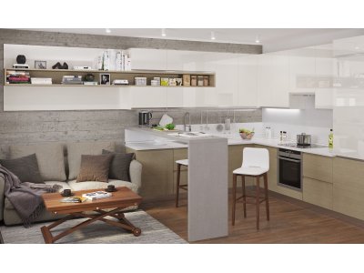 Фасад толщиной 22 мм с интегрированной J ручкой. Фасад с рамкой и филенкой из МДФ покрытый декоративная высокотехнологичной 2D пленкой Alkorcell («Экошпон»), а так же МДФ с глянцевым пластиком HPL...