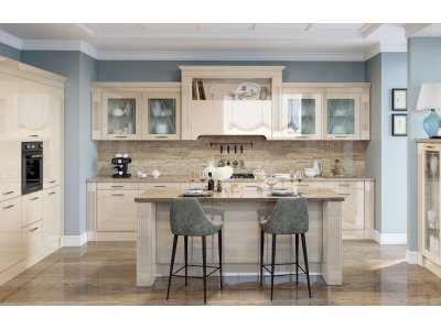 Фасад выполнен из МДФ и облицован пленкой ПВХ. Толщина фасада 20мм (МДФ 19 мм +1 м ПВХ). Фасад ровный соответствует фасаду модели Сантина. Рамочный фасад имеет рамку шириной 90мм, аналогично фасаду модели Кремона. В модели используется стекло Лугано Стопсолл классик с лазерной гравировкой...